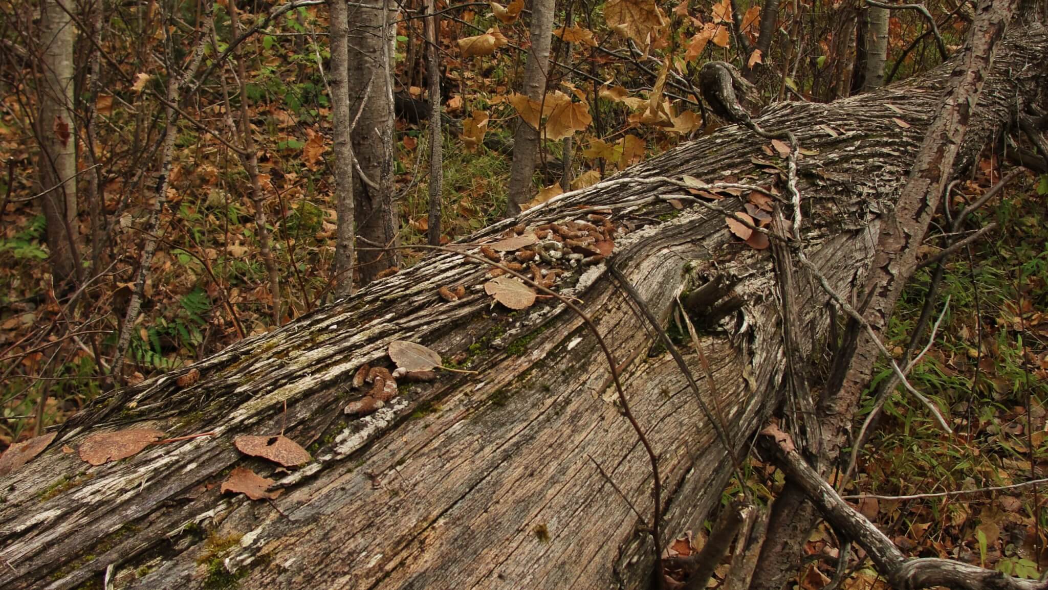 Drumming logs aren’t just for spring. Male grouse will use this territory year-round because he picks drumming logs in the best grouse habitat. If you see signs of past drumming—feathers, droppings, scratch marks then make a map pin to record it. That bird didn’t pick the spot by accident.