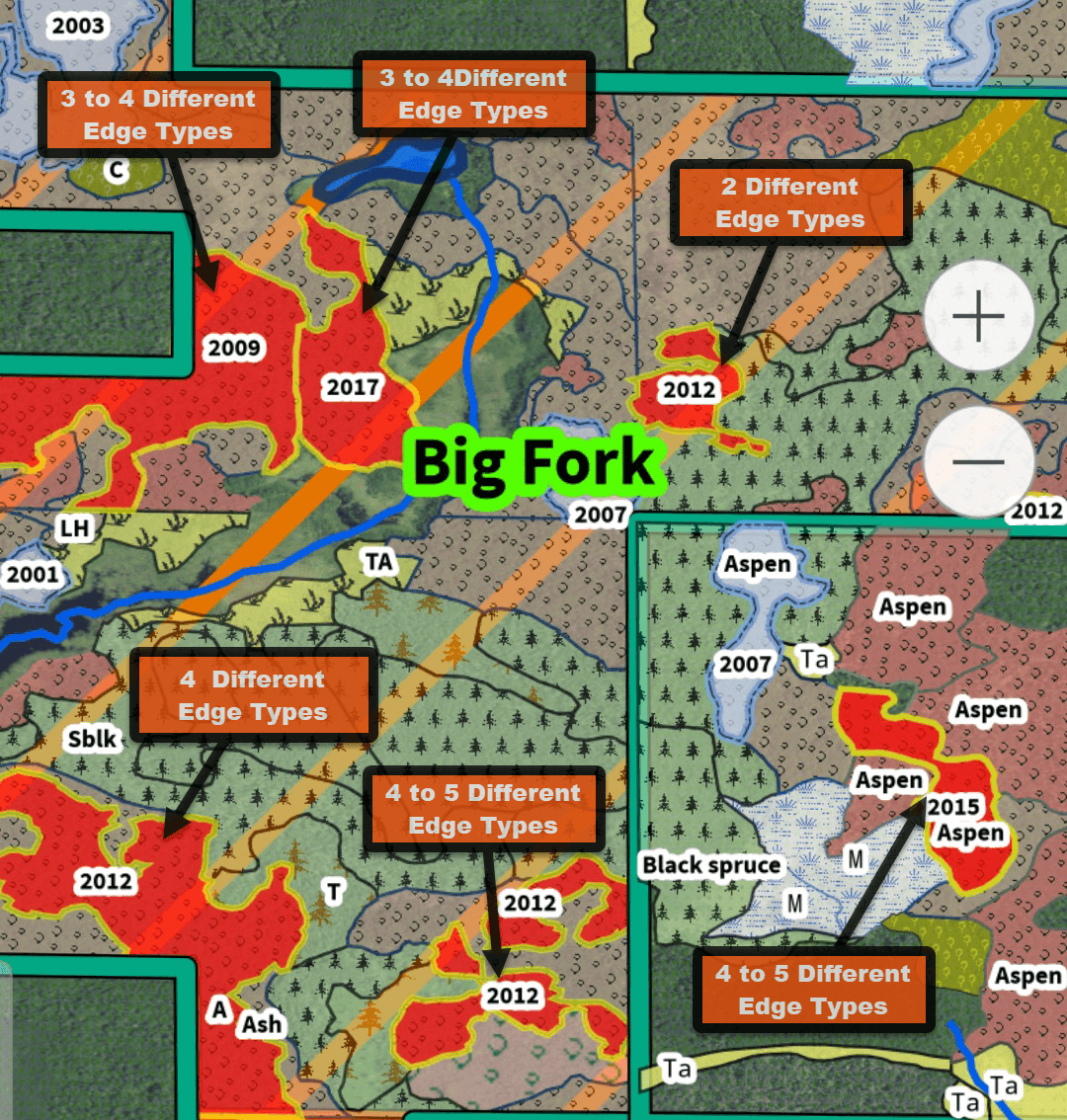 – Identify “cover transitions” to find aspen-to-alder areas or aspen to conifer, or your upper areas aspen to hardwoods.